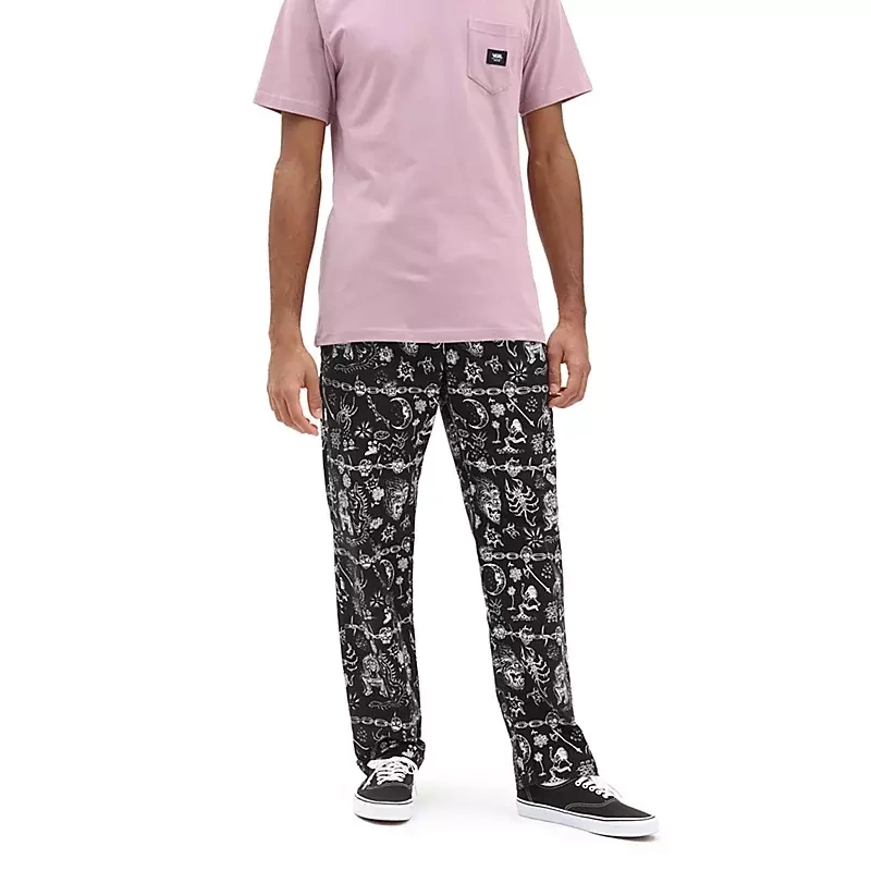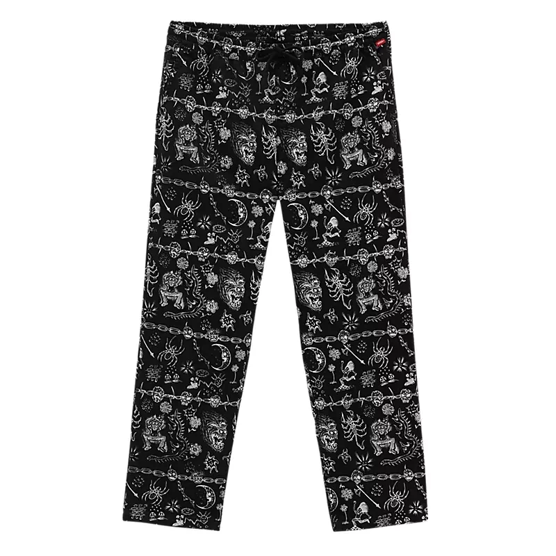Czerpiące z klasycznej stylistyki marki Vans „Off The Wall” spodnie Mike'a Gigliottiego Range Loose ze zwężanymi nogawkami dodają charakteru naszym wygodnym spodniom z kolekcji „Off The Wall” dzięki stworzonej przez Mike'a i pokrywającej całą powierzchnię ubrania grafice. Ściągane sznurkiem spodnie z wysokim stanem i wygodną elastyczną talią zapewniają jeszcze lepsze dopasowanie, są luźne w biodrach i udach oraz mają zwężane nogawki. Dzięki zastosowaniu bawełny są miękkie w dotyku, a subtelne detale z logo marki zadają szyku. Ponadto po bokach i na kieszeniach mają haftowane szwy ryglowe z motywem „Drop V”, pętelkę w kształcie litery V na prawym tylnym pasku oraz metkę z logo na obszyciu otworu nogawki, którą widać po jej podwinięciu.
